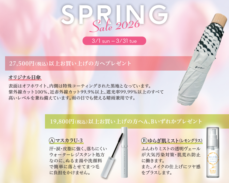 セール期間中に綺羅化粧品の商品を27,500円(税込)以上お買い上げのお客様に、KIRAオリジナル日傘をプレゼント!また、19,800円(税込)以上お買い上げのお客様には、「マスカラU-3」または「ゆらぎ肌ミスト」をご用意しました。